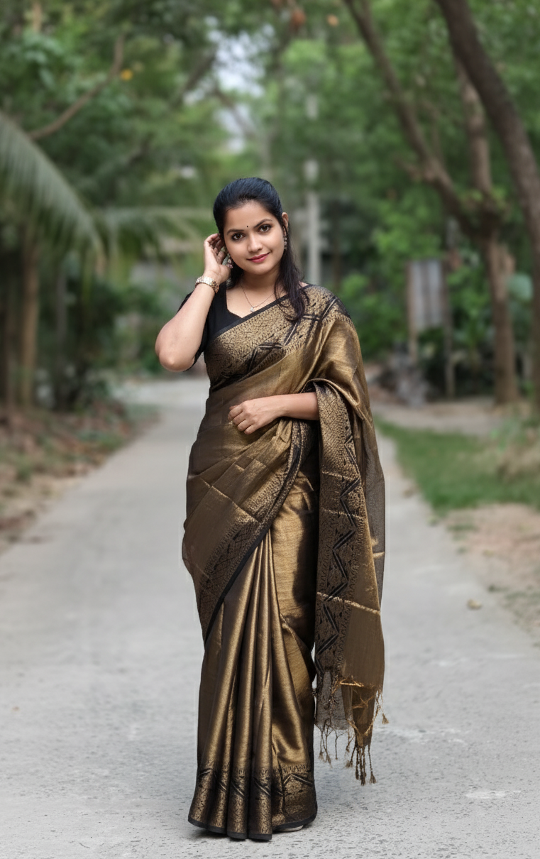 Elegant Bronze Gold Tissue Handloom Saree with Black Zari Border | Lightweight Festive & Party Wear Saree | Traditional Handwoven Silk Blend Saree for Women