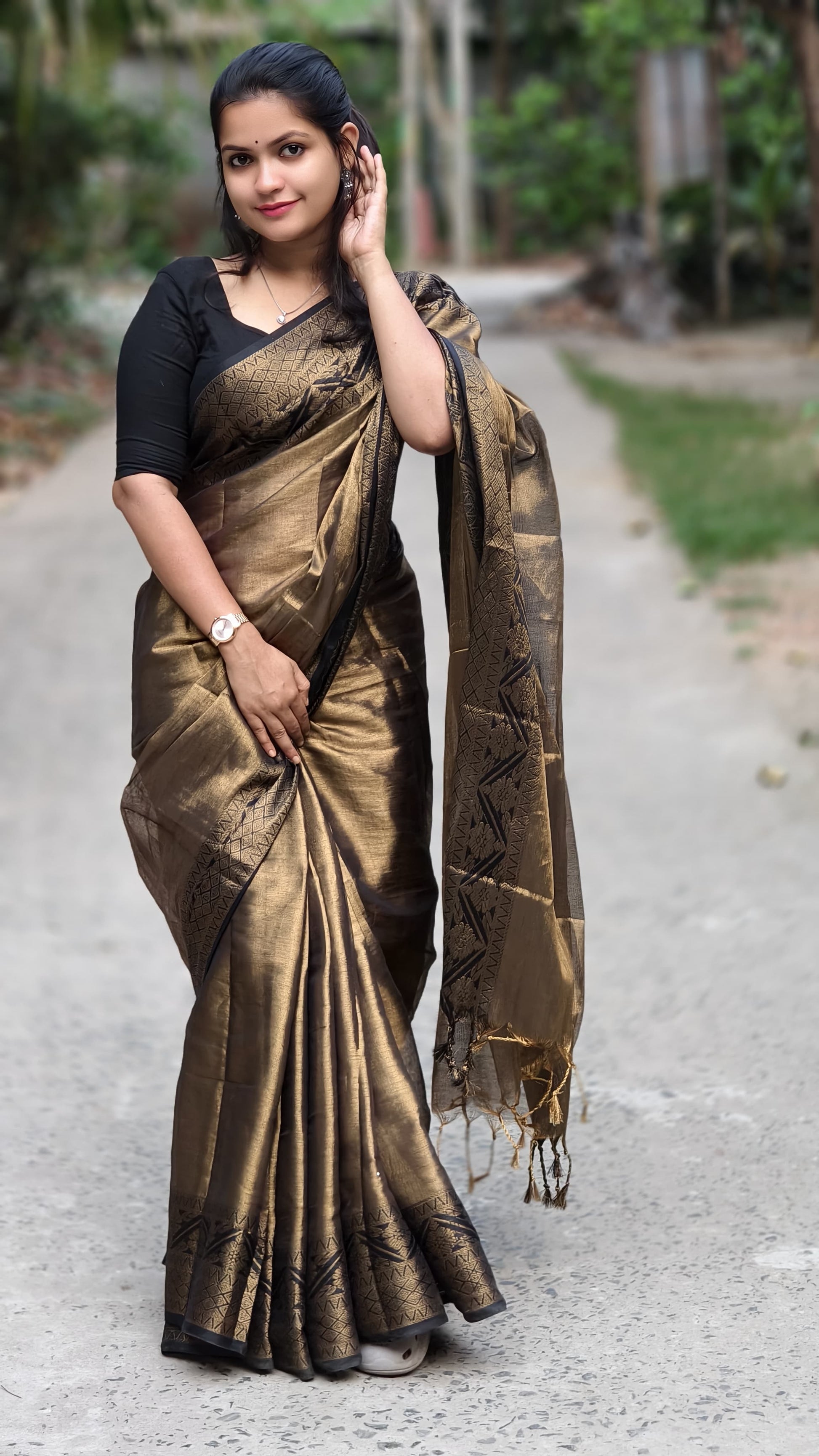 Discover the exquisite charm of our Elegant Bronze Gold Tissue Handloom Saree, a stunning blend of tradition and contemporary style. Crafted with love and attention to detail, this lightweight saree features a luxurious black zari border that beautifully contrasts with the soft, shimmering bronze gold fabric. Perfect for festive occasions and parties, it drapes gracefully, offering comfort without compromising on elegance. This handwoven silk blend saree is designed for the modern woman who appreciates the artistry of traditional craftsmanship while making a bold fashion statement.