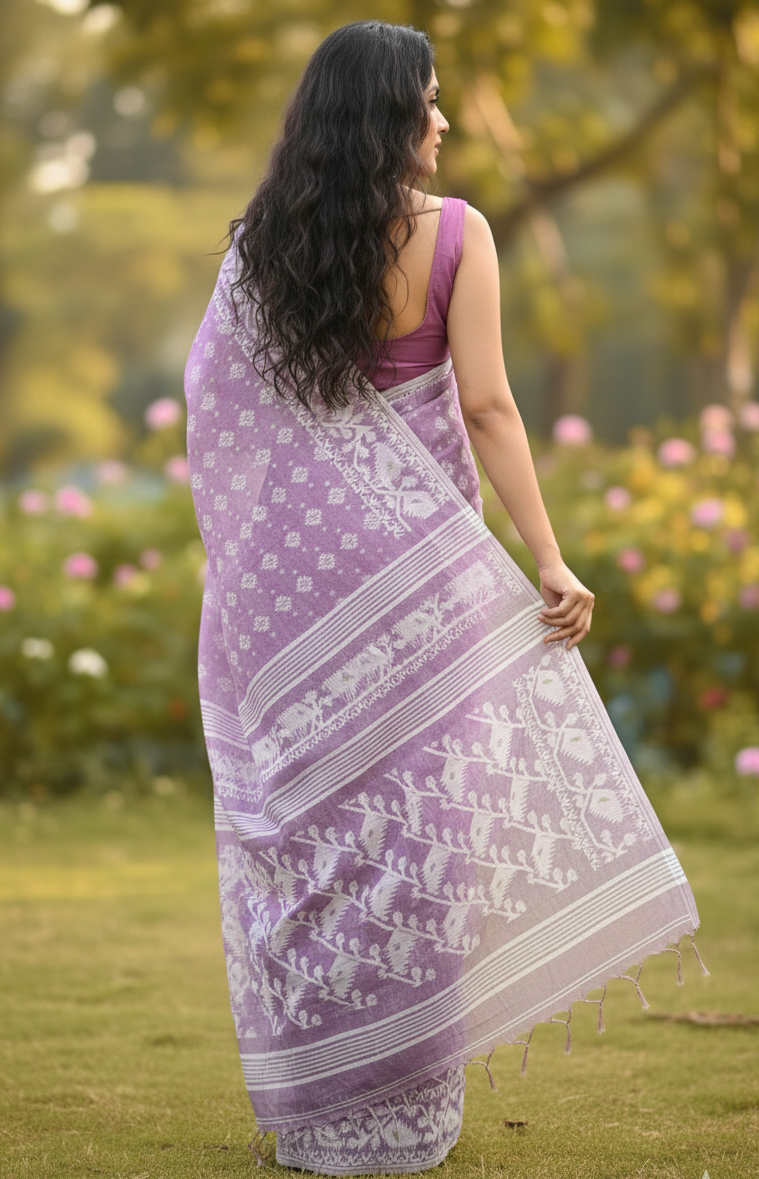 Lavender Dhakai Jamdani Saree with Mina Work | Handwoven Pure Cotton Saree with Blouse Piece | Traditional Bengali Saree for Festive & Wedding Wear